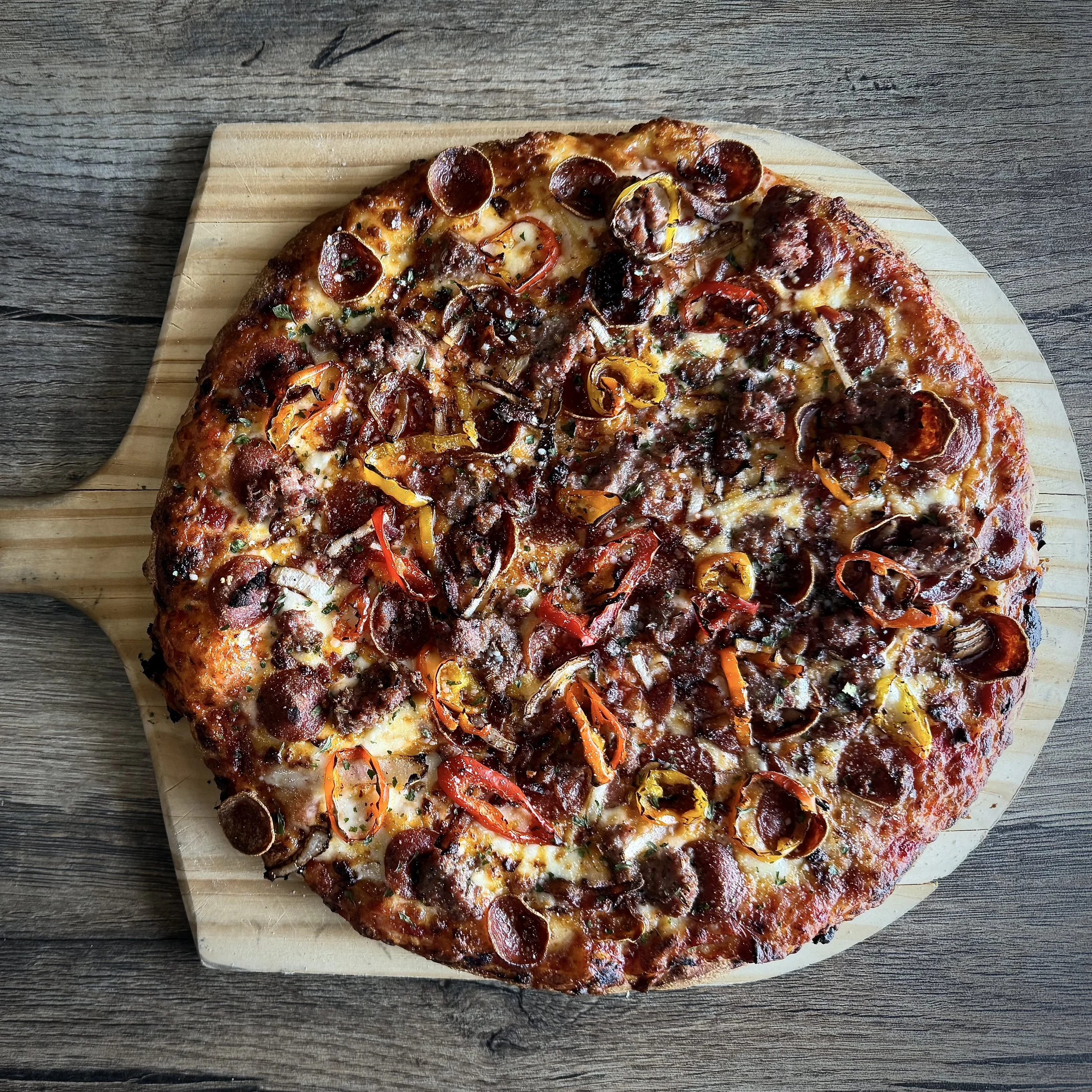 Garlic Oil, Red Sauce, Mozzarella & Provolone, Smoked Cheddar, Old World Pepperoni, Bacon, Sausage, Onions, Banana Peppers, Parmesan, & Parsley
